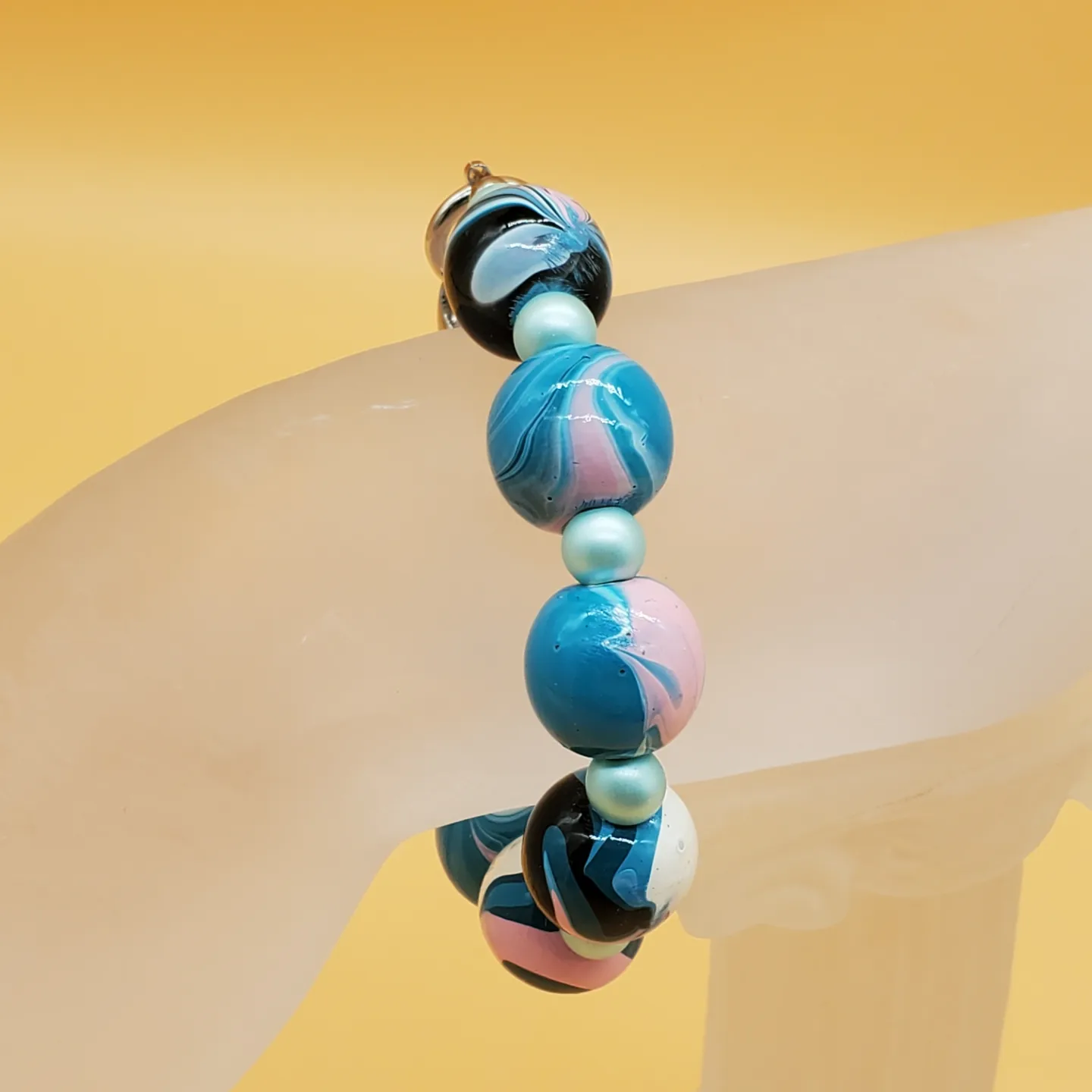 This bracelet is made with seven spherical wooden beads. I hand-painted and varnished each bead individually. I painted them with DecoArt Fluid Art Ready-To-Pour Acrylic Paint. Due to the nature of my technique, each bead has its own distinct pattern. It takes me three weeks to prepare each bead for jewelry making. My process involves painting, drying, polishing, and varnishing the beads. I work on one batch of beads at a time. All photos depict the same bracelet. Because each bead is double-sided, the product you receive may differ slightly from photos. You may turn beads to alter the appearance of the bracelet and even replicate the photo. The bracelet is 7 1/4 inches in length and has a lobster claw clasp. Please avoid pulling or stretching the string. Doing so may cause it to snap. I placed glass beads between each bead. Light is reflected in some of the pictures.